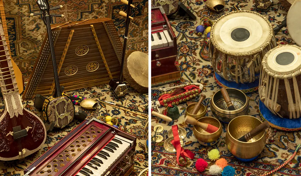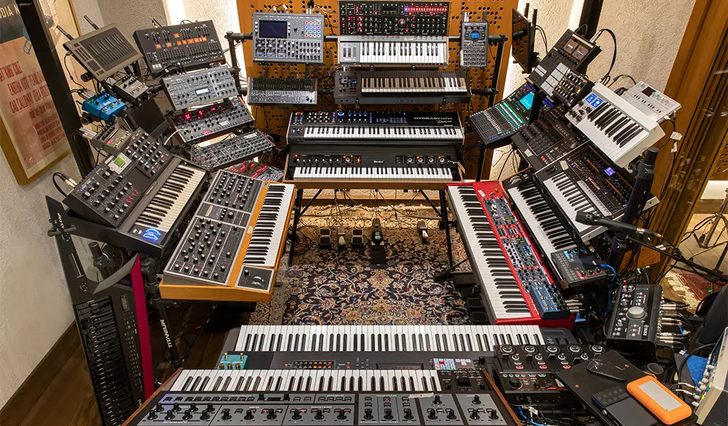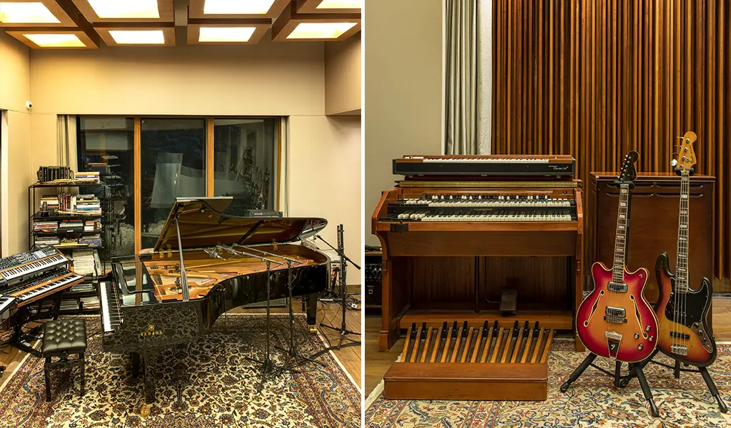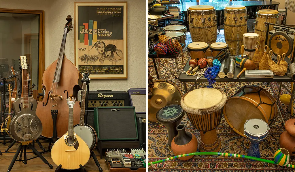 Collection of analog and modular synthesizers (Moog, Prophet, Oberheim, Sequential, Erica Synths, Buchla), keyboards, basses, guitars, drums, ex otic percussions from the Amazon, collection of oriental and Middle Eastern flutes, Indian instruments (sitar, sarod, sarangi, tablas), and classical and modern instruments.