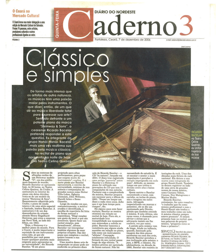 “Jazz pianist Ricardo Bacelar´s new release focuses on the roots of Brazilian music with its sprawling list of reinterpretations and originals such as the ethereal Nothing Will Be As It Was”…